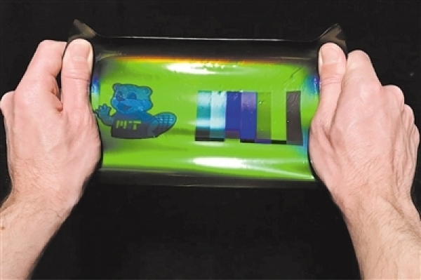麻省理工学院研究人员利用彩色摄影技术,将大尺寸图像打印到弹性材料上,拉伸时可以改变其颜色,随着材料的应变反射不同的波长。图片来源:麻省理工学院