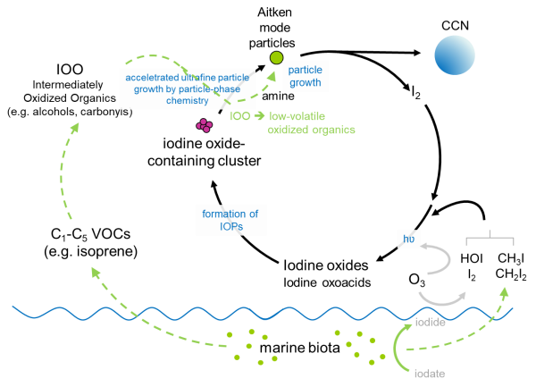 瞄准这一科学难题,中国科学院地球环境研究所研究员黄汝锦联合德国美茵茨大学、爱尔兰国立高威大学、芬兰气象研究所、美国得克萨斯A&M农工大学、美国加州理工学院等,开展了外场观测、实验分析和模型模拟综合研究。研究从反应机制的角度出发,发现海洋微生物排放的异戊二烯等含1-5个碳的挥发性有机物在大气中氧化为醇和碳基化合物等中等氧化有机物后,可与成核后的碘氧粒子发生非均相氧化-还原反应,生成水溶性/低挥发性有机酸,氧化生成的有机酸可进一步与氨气/有机胺发生酸碱反应生成化学性质稳定的盐,促进碘氧粒子成核后的快速增长。与经典的“凝结”增长机制相比,该“非均相反应”增长机制使海洋大气新粒子增长所需的气态有机物浓度降低了一个数量级,促使海洋大气新粒子的增长速率提高了一个数量级。该机制可较好地解释大洋和极地碘和挥发性有机物浓度较低的环境下海洋大气新粒子生成现象。该研究还揭示了碘氧粒子在氧化有机物的同时被还原为碘分子,碘分子从颗粒相释放出来重新进入气相后,开始新一轮的碘氧化成核过程,从而实现碘在气相和颗粒相的循环,提出以“碘”为中心的多相反应海洋大气新粒子生成机制新认识。