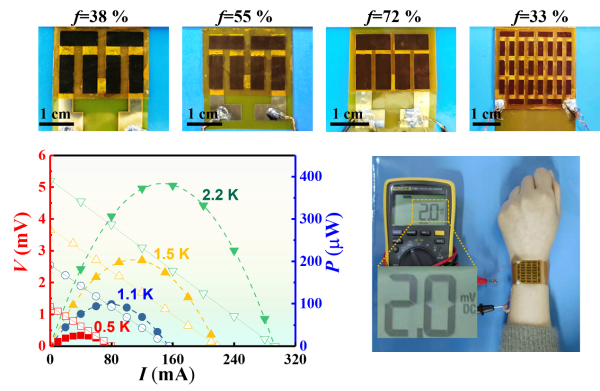 图3.基于无机塑性材料的超薄热电器件实物图及器件性能(6对,f=72%)。