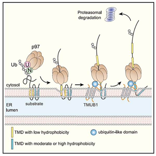 膜蛋白的跨膜区通常由一个或多个疏水跨膜螺旋(Transmembrane domains,TMDs)构成。它们整合在内质网膜中,且和膜磷脂紧密地结合。因此,膜蛋白的跨膜逆向转运要克服能量障碍,让疏水跨膜螺旋和磷脂分离,这一过程由AAA-ATPase p97水解ATP产生的拉力来驱动。当某一疏水跨膜螺旋从内质网膜中分离后,必须被持续地护送直至与p97相结合,以避免在细胞质的水环境中非特异性聚集或产生不必要的互作,导致蛋白质降解受抑制并引起内质网或细胞应激。然而,膜蛋白的疏水跨膜螺旋持续地被护送至p97的具体机制尚无研究。