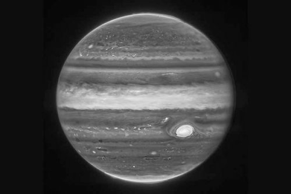 图像由带有专门红外滤光片的近红外相机拍摄,由于红外线对人眼是不可见的,因此这些光被映射到可见光谱上,以突出木星的特定细节。