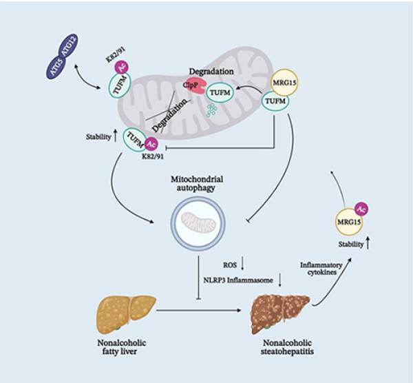 近日,该团队等研究人员在Journal of Hepatology上在线发表标题为MRG15 aggravates nonalcoholic steatohepatitis progression through regulating the mitochondrial proteolytic degradation of TUFM的研究论文,发现在NASH发生过程中,炎症因子会增强MRG15的蛋白稳定性,而MRG15会在线粒体外膜与线粒体Tu翻译延伸因子(TUFM)相互作用并下调TUFM的82和91赖氨酸位点乙酰化水平,从而促进TUFM被线粒体ClpXP蛋白酶体降解。肝脏中TUFM的减少会导致线粒体自噬受到抑制、氧化应激增加以及NLRP3炎症小体激活,加重炎症和纤维化。在肝脏中敲除MRG15后可以显著减缓小鼠NASH发展进程,该研究为NASH治疗提供了潜在的靶点。
