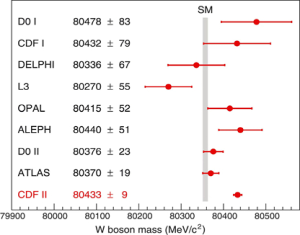 图1.目前,所有测量W玻色子质量的实验结果总结,灰色柱状区域代表标准模型的理论预言值和误差范围。