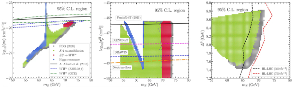 图2.左为同时满足银心GeV伽马射线超出和反质子超出的暗物质质量区间(红色区域),中为类标准模型希格斯粒子(SM-like Higgs)共振湮灭过程在暗物质直接探测上的观测前景(蓝色区域),右为暗物质粒子与次轻中性希格斯粒子(A)共同湮灭过程在高亮度强子对撞机上的可观测预期(绿色区域)。
