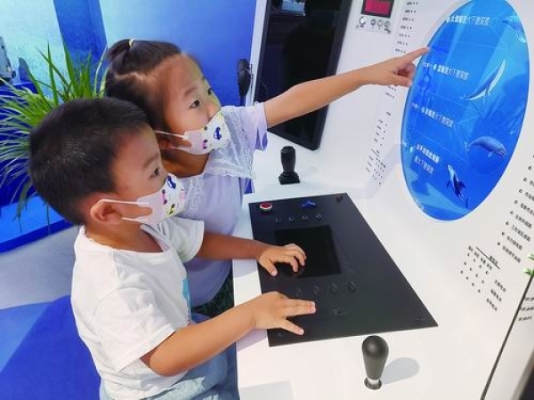 小朋友们在“奋斗者”号座舱模拟装置中体验。倪思洁摄