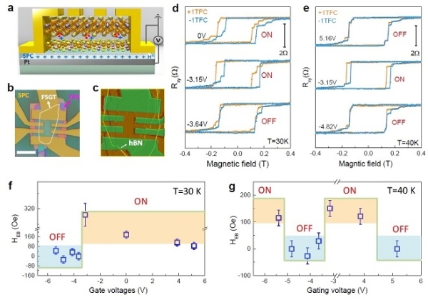 (a)-(c)异质结器件示意图以及其光学显微镜以及原子力显微镜图像。(d)-(g)不同温度下质子门电压对交换偏置效应的调控。