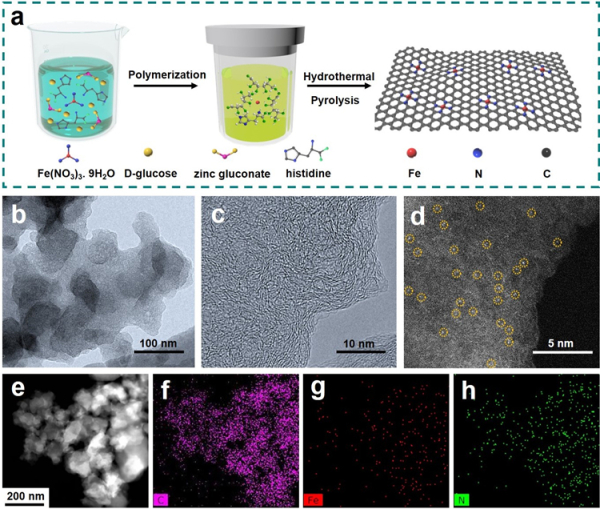 近期,中国科学院青岛生物能源与过程研究所研究员梁汉璞团队通过一种简单的隔离锚定策略,制备了多孔氮掺杂碳负载的铁单原子催化剂(Fe1/NC)(图1)。该方法利用D-葡萄糖、葡萄糖酸锌和组氨酸来分散和锚定铁原子。研究人员通过组氨酸的咪唑基团螯合Fe3+,实现金属原子的初步锚定。在水热过程中,含有大量羟基的D-葡萄糖和葡萄糖酸锌会在高温高压环境下与组氨酸中的羧基发生反应,进一步分散金属原子。通过高温热解去除锌和多余有机物后,即可得具有丰富孔结构的Fe1/NC催化剂。研究发现,与商业Pt/C催化剂和大多数报道的铁单原子催化剂相比,通过该策略制备的Fe1/NC催化剂在碱性和酸性溶液中均表现出优异的氧还原催化性能,其具有较高的活性、较强的甲醇耐受性和良好的稳定性。更重要的是,用Fe1/NC组装的锌空气电池具有较高的功率密度(164 mW cm-2),较大的放电比容量(769.0 mA h gZn-1),以及超过300 h的优异稳定性。这项工作对制备高效、稳定的金属-空气电池氧还原催化剂具有重要意义。