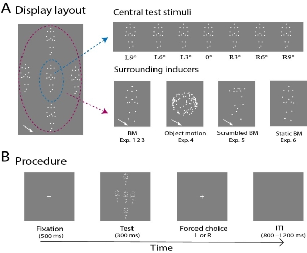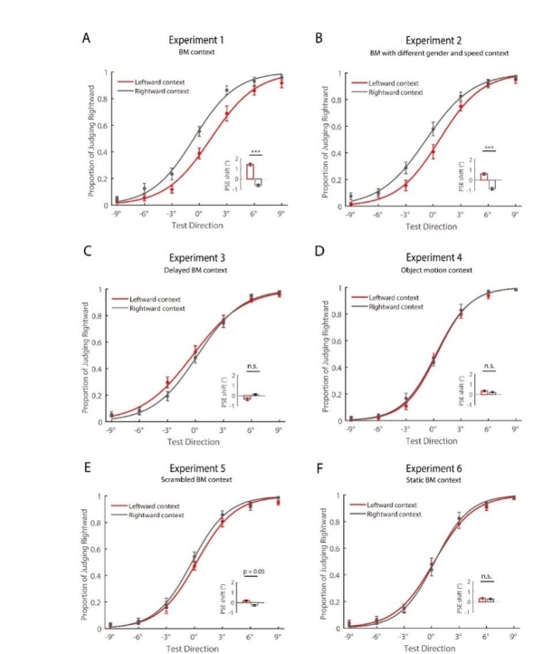 研究发现,个体生物运动的行走方向会被周围群体生物运动的行走方向所“吸引”,表现为情境吸引效应(实验1)。即使改变了周围群体生物运动的行走速度和性别信息,该效应几乎不受影响(实验2);如果周围群体生物运动与中间个体生物运动不是同时出现,而是先后呈现,该效应则消失(实验3)。此外,如果研究将行走的周围群体生物运动换成向左或向右滚动的非生物运动的小球,也不会引发上述效应(实验4)。即使周围群体生物运动换成空间位置置乱的局部运动生物,依然可以诱发一定的情境效应(实验5);如果周围刺激只是静止的生物体形态,则无法诱发上述效应(实验6)。