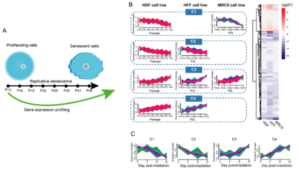 细胞衰老过程是一个由多种因素驱动的动态过程。已有研究通过比较年轻和衰老细胞,发现细胞衰老相关的转录组特征,但这些衰老相关信号如何随着衰老过程的推移而改变尚不清楚。鉴于此,中国科学院昆明动物研究所研究员孔庆鹏团队以人皮肤成纤维细胞(HDF)为研究对象,收集了从年轻到复制性衰老过程中8个时间节点的HDF细胞进行转录组测序。时间序列表达谱分析发现,细胞衰老过程中基因的表达模式存在四个动态变化轨迹(C1、C2、C3、C4)。具体表现为,一些基因在细胞增殖过程中线性地上调(C4)或下调(C2),而一些基因则是细胞生长前期保持稳定,直至进入衰老状态才发生表达变化(C1、C3)。进一步功能分析表明,这四种模式的基因参与了不同的生物学途径。考虑到细胞衰老存在的细胞类型和衰老类型异质性,研究收集了其他类型复制性衰老细胞(HFF和MRC5)和电离辐射诱导的细胞衰老的时间序列数据集。分析发现,上述四种模式在不同细胞类型的复制性衰老过程中具有保守性,而在不同衰老类型中则存在较大异质性。研究发现,核糖体和氨基酸分解代谢相关功能在两种类型的细胞衰老过程中均表现出持续减弱的趋势;而细胞周期和碱基修复相关通路在复制性衰老中受到比电离辐射诱导衰老更严格的调控。该研究剖析细胞衰老的动态变化,为探索细胞衰老过程中基因表达模式及变化规律提供了新认识。