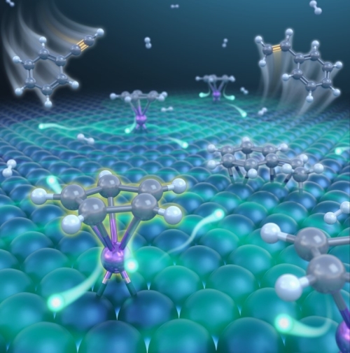 负载型金属催化剂被广泛应用于化学品的合成。助剂(氧化物、分子、配体等)常被用来进一步调控金属催化剂的性能。然而,助剂在实际反应中发挥的作用尚不明确,原因在于其在金属纳米颗粒表面的落位和组成精准控制的难度较大。既往研究注意到过渡金属配合物和金属单晶会形成金属-金属相互作用,产生特殊的电子和空间作用,而鲜有关于配合物和金属表面作用调控催化性能的实例。
