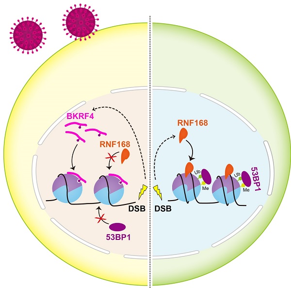EB病毒(Epstein-Barr virus)是一种具有双链DNA基因组的γ疱疹病毒,与多种恶性肿瘤相关。研究发现,EB病毒的被膜蛋白BKRF4与人体组蛋白H2A-H2B二聚体和H3-H4四聚体相互作用,BKRF4破坏损伤修复因子RNF168的招募,干扰宿主DDR,BKRF4的高表达与病毒致癌性相关。因此,揭示BKRF4识别并调控染色质结构的机制,对于剖析EB病毒与宿主之间的“博弈机制”颇为重要。