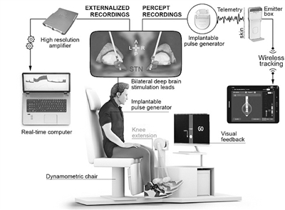 神经机器人平台的示意图。该平台研究在舒适和良好控制的条件下腿部肌肉激活的编码。患者进行膝关节伸展等运动,该装置记录肌肉激活和来自丘脑下核(STN)的信号。图片来源:《科学·转化医学》