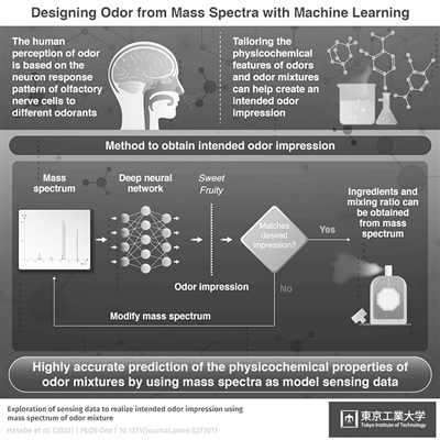 东京工业大学研究负责人中本高道教授解释说:“我们使用了一个基于机器学习的气味预测模型,以获得气味印象。然后,我们根据先前开发的正向模型逆向预测了气味印象的质谱。”