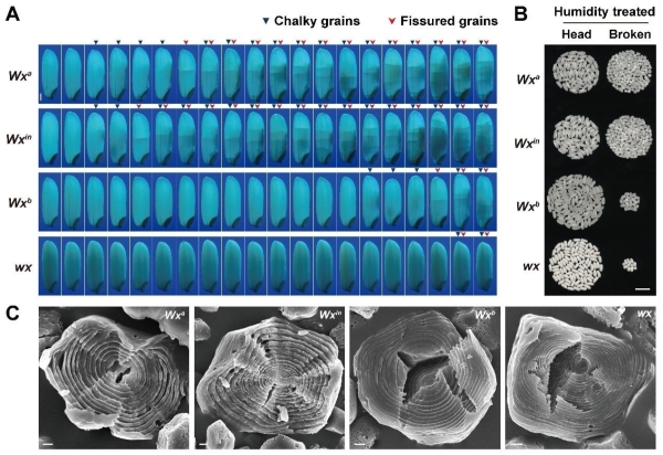 Wx遗传变异近等基因系的稻米裂纹粒率(A)、整精米率(B)和胚乳淀粉粒生长环结构(C)的比较