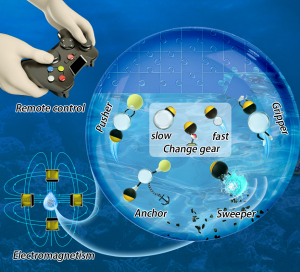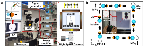 图1.基于三维Helmholtz磁控系统采用手柄即可对气泡微机器人进行灵魂操控