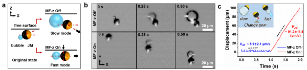 图2.通过磁场调整液气界面附近Janus微球的朝向以实现气泡微机器人的远程速度调制