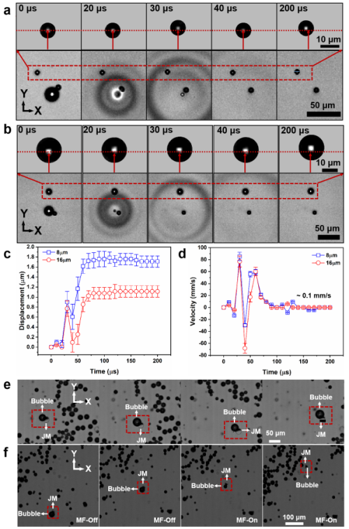 图3.通过调整Janus微球、微气泡、目标物的相对位置,利用射流流动及表面波实现了对目标推进、锚定、抓取、清扫等不同功能