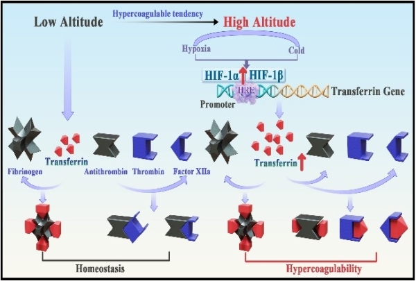 中国科学院昆明动物研究所研究员赖仞团队在血液生理、血栓疾病发病机理和低出血风险抗血栓新药研发方面取得了系列研究成果。近日,该团队与多伦多大学研究团队合作,发现在高海拔地区长期居住的人群和高海拔短期旅行的实验小鼠血浆中关键凝血调控因子转铁蛋白的浓度以及凝血酶和凝血因子XIIa的活性显著升高。进一步动物和细胞实验证实,低氧和低温这两个关键的高原有害因素增强了低氧诱导因子的表达,进而促进转铁蛋白的表达,进一步增强凝血酶和凝血因子XIIa活性,从而诱导血浆高凝倾向。研究表明,高海拔转铁蛋白上调可增加铁离子转运并促进骨髓红细胞的成熟从而增加供氧;转铁蛋白的上调诱导高凝倾向、减缓血液循环从而减少热量损失和氧气消耗,这可能是生物应对低氧和低温这两个极端环境的重要生理补偿策略。重要的是,转铁蛋白干预,包括转铁蛋白抗体治疗、转铁蛋白敲降和设计抑制转铁蛋白凝血因子相互作用的多肽能有效抑制高海拔小鼠模型血栓事件的发生并提高小鼠的生存率。该研究为抗高原血栓新药研发提供了干预策略和全新思路。