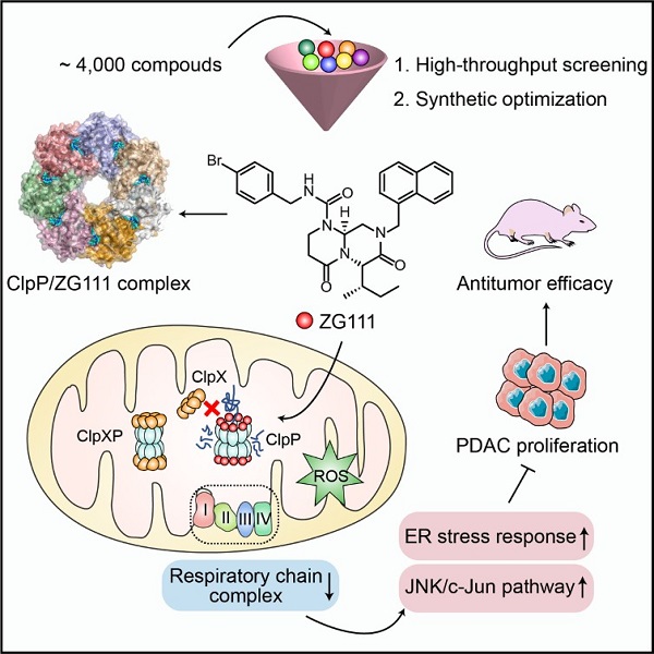 研究团队基于数据分析发现,CLPP基因高表达与胰腺癌病人的预后正相关,并且胰腺癌组织ClpP蛋白质比正常组织丰度显著偏高。基于遗传操作的细胞水平和动物模型研究都展示,ClpP水解活性的增强显著抑制胰腺癌细胞增殖以及成瘤性,预示着ClpP活性激动抗胰腺癌的可行性。高通量筛选结合合成优化获得新骨架的ClpP激动剂ZG111,在不同KRAS基因型的胰腺癌细胞中均激活ClpP蛋白水解酶功能,干预线粒体呼吸链复合物稳态,间接抑制OXPHOS功能抗胰腺癌细胞增殖。ZG111对不同KRAS遗传背景的异种移植胰腺癌模型均有较好的抗肿瘤作用,表明ClpP的功能紊乱激活可能是胰腺癌的潜在治疗策略。