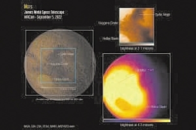 据英国《新科学家》杂志网站19日报道,詹姆斯·韦布空间望远镜近日发布了其拍摄的首张火星红外图像,捕获了整颗行星的大气数据,这将帮助天文学家识别以前仪器无法识别的现象和气体,更好地了解火星的大气层。