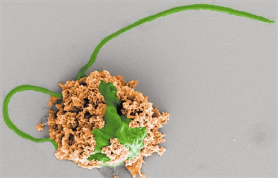 抗肺炎微型机器人的彩色SEM图像,该微型机器人由覆盖有可生物降解聚合物纳米颗粒(棕色)的藻类细胞(绿色)制成。图片来源:《自然·材料》