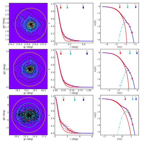以三个典型疏散星团(NGC_2972、NGC_6811、Gulliver_17)为例。左图显示疏散星团在位置空间的分布,红色区域为传统认知的星团区域,黄色为本文标记的星团区域。中图和右图中,红点为疏散星团的径向密度分布轮廓,红线实线为传统King模型,蓝色实线为本文的两成分模型。疏散星团的物理尺度相比传统认知有了很大的扩展,双成分模型更好地描述了新认知下的疏散星团径向密度分布。