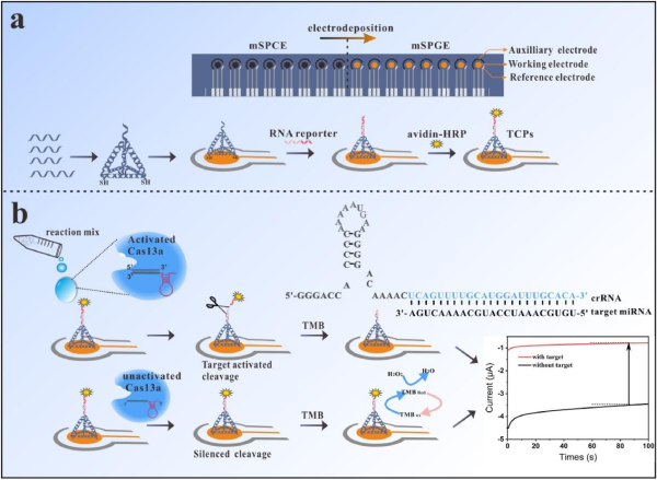 近日,中国科学院上海微系统与信息技术研究所研究员宓现强课题组构建了一种基于CRISPR的电化学传感器(CRISPR-E)。该研究将DNA四面体框架结构修饰在印刷电极上,进一步与RNA探针杂交,最后连接HRP分子构建TCP探针;通过将电化学技术、DNA四面体框架结构与CRISPR技术相结合,利用Cas 13a在crRNA的引导下识别靶RNA后能够对单链RNA表现出“附带切割”能力,实现了对miRNA的无扩增、高灵敏度检测。由于整个反应过程可以在电极上实现,因此有望推动miRNA的及时快速(POC)检测。