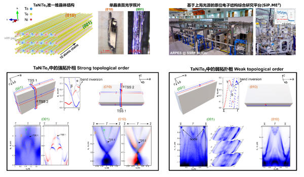 近日,中国科学院上海微系统与信息技术研究所研究员叶茂、乔山团队与日本东京大学教授Takeshi Kondo合作,成功制备了一种准一维拓扑材料TaNiTe5,并利用上海微系统所牵头建设的“基于上海光源的原位电子结构综合研究平台”的高精度微聚焦角分辨光电子能谱线站(上海光源BL03U)首次直接观测到了该材料中强弱拓扑序共存的独特电子结构。相关研究成果以Coexistence of Strong and Weak Topological Orders in a Quasi-One-Dimensional Material为题发表于Physical Review Letters。