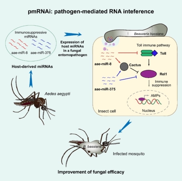 研究团队将利用“以子之矛,攻子之盾”的策略构建表达昆虫来源miRNA的工程菌株,通过跨界RNA干扰害虫基因的表达来提高生防菌毒力的新方法称为病原菌介导的RNAi(pathogen-mediated RNAi,pmRNAi)。该方法具有以下优点:1、与靶标单一的杀虫毒蛋白相比,miRNA具有多靶标特性,单个miRNA可以在一个或多个途径中靶向多个基因来发挥其生物学功能,此外,单个靶基因也可受到多个miRNAs的组合调控;2、理论上,一个菌株中可表达多个寄主miRNAs,实现对害虫免疫或其他生理过程的重要靶基因或通路进行操纵,进一步提高真菌杀虫剂的防效,使得该方法在生防菌的遗传改良上具有巨大应用潜力;3、某些昆虫来源的miRNAs具有种属特异性,可通过定制害虫特异的miRNA提高工程菌的寄主靶向性和特异性;4、使用寄主来源的miRNA进行菌株改良可以避免害虫产生选择压力,因为昆虫对自身免疫和生理健康至关重要的内源性miRNA不易产生选择抗性;5、相比于外源毒素或毒蛋白基因,使用害虫自身的miRNA可以消除公众对于工程菌株生物安全性的担忧。该研究提出的策略,利用丰富的寄主miRNAs改造生防菌,为开发安全和高效的真菌等生物杀虫剂开辟了新方向和新思路,为蚊虫和其他害虫的绿色防治提供了新工具。